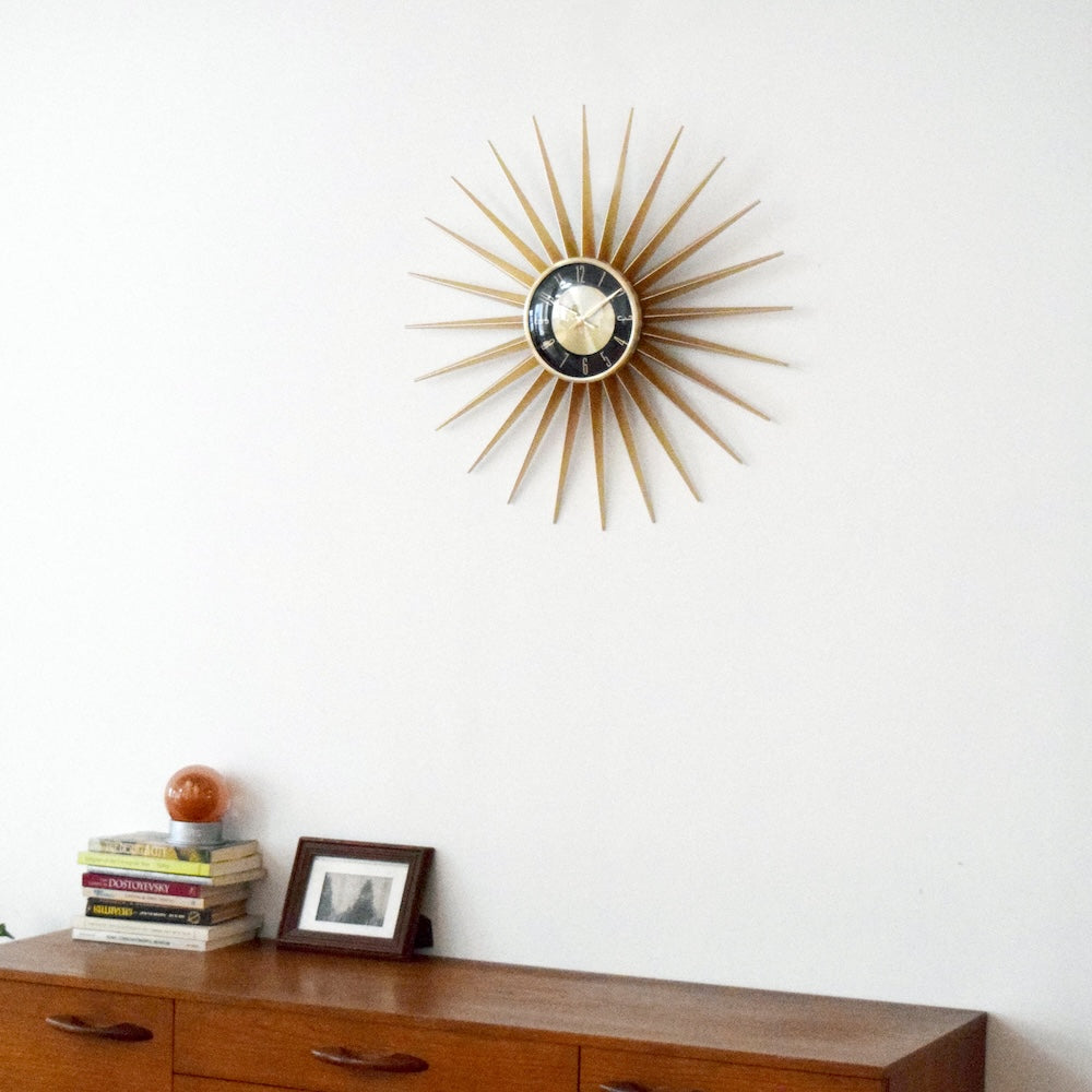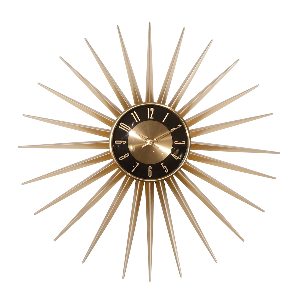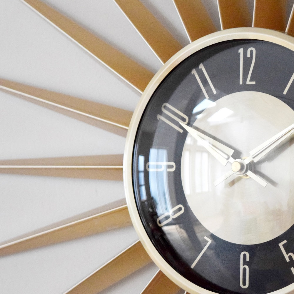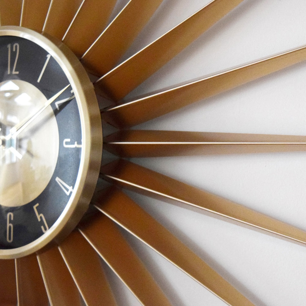 現在は希少と言われるミッドセンチュリーのヴィンテージサンバーストクロック。ビンテージと比較しても引を取らない迫力とデザインが気に入っています。実際に自宅や店舗で使用していますが、空間のディスプレイには本当にお勧めです。壁掛けのポスターや什器などと合わせて楽しんで頂ける素敵なアイテムだと思います。コストパフォーマンスもかなり高いです。
